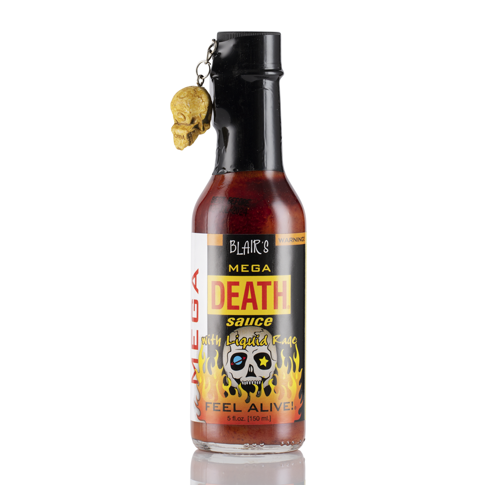 Blair’s Mega Death saus inneholder ingredienser 650 ganger sterkere enn en jalapeño pepper. Denne sausen er nødeløs sterk og burde brukes med forsiktighet.
