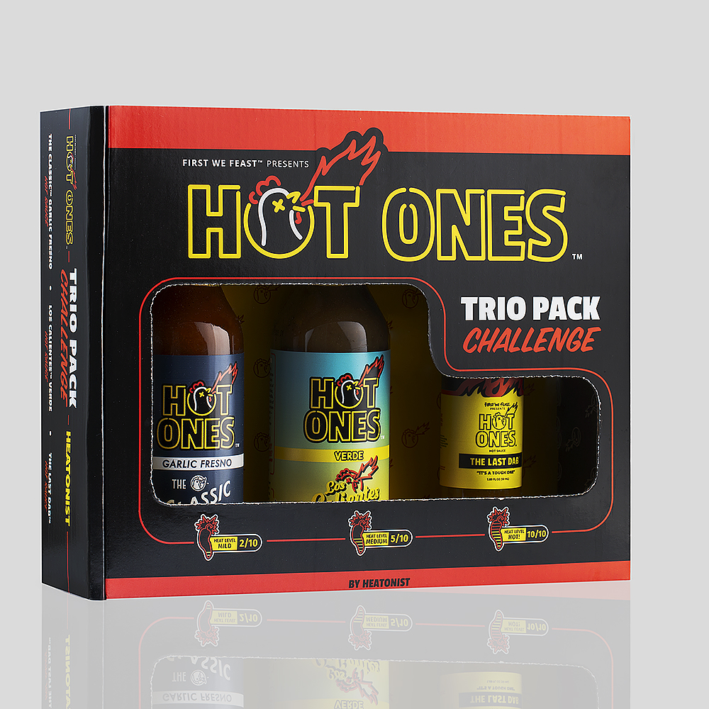 Vil du oppleve Hot Ones’ hot sauce, men er ikke klar for å ta fatt på hele serien? Vår Mini Dab Challenge Pack inneholder tre av de mest populære hot saucene fra showet, med hete spørsmål og enda sterkere vinger. Lag din egen mini wing-utfordring, start med den milde og hvitløksaktige The Classic Garlic Fresno Edition eller «Blue Label». Varm deretter opp med Hot Ones’ originale sommersaus, Los Calientes Verde, med serranos, middels sterke habanero-pepper og Baja California-inspirert smak. Til slutt er det tradisjon her å legge til en ekstra dæsj av The Last Dab til den siste vingen, og denne utfordringspakken er intet unntak. Opplevelsen avsluttes med en begrenset opplagsprøve av Hot Ones’ hot sauce, The Last Dab. Dypp tærne i vannet på Mt. Scoville med denne hot sauce-gavepakken, perfekt for Hot Ones-fans, nye krydderelskere og for å prøve disse populære hot saucene før du hopper over Hot Ones 10-Pack. Vi er sikre på at du kommer tilbake for mer. Hvorfor? Mini dab, stor smak!
