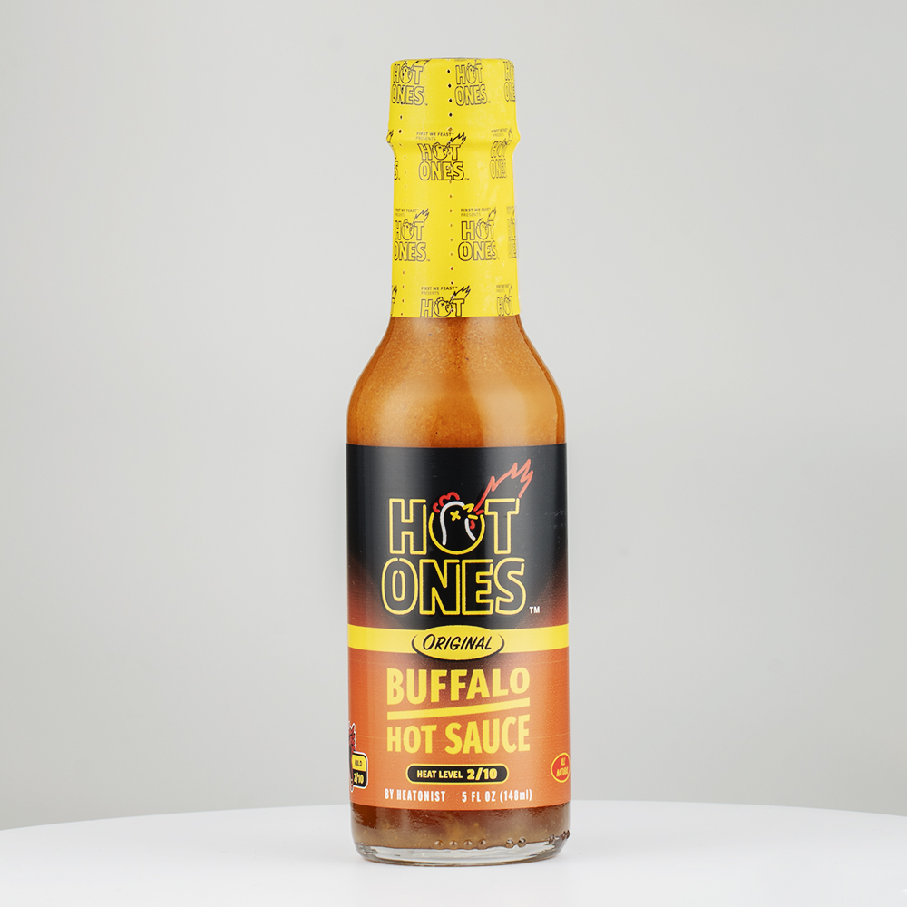 Vi introduserer Hot Ones’ første Buffalo-saus, en fyldig og syrlig kombinasjon av mild Cayenne-pepper, destillert eddik og ekte smør (ingen kunstige smakstilsetninger her). Som et show kjent for å mate folk med kyllingvinger, visste vi at hvis Hot Ones la ut en Buffalo-saus, måtte det være fantastisk. Vi hentet inspirasjon fra klassiske Buffalo wings og la til vår egen vri med morsomme, ferske ingredienser som selleri, melasse, chipotle og røkt paprika for velsmakende godbiter. Med smøret og krydderet allerede i flasken vår, kan du helle Hot Ones Buffalo Hot Sauce direkte på varme vinger – ingen smelting og blanding nødvendig.