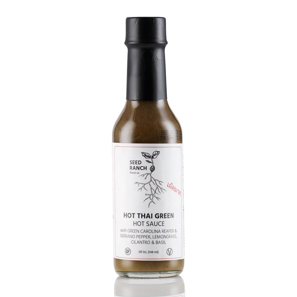 The Hot Thai Green er vår krydreste, lyse, aromatiske saus. Denne unike sausen er sitrusaktig og urteaktig med et krydret spark på slutten fra Green Carolina Reaper pepper. Som sett på HOT ONES sesong 11!