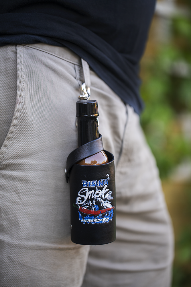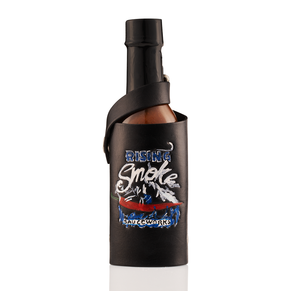 Hold din favoritt Rising Smoke Sauceworks-smak på din side til enhver tid. Ikke gå hjemmefra uten dette stilige tilbehøret. Dette skreddersydde håndlagde og håndmalte skinnhylsteret er en flott gaveide til chileheaden i livet ditt!
